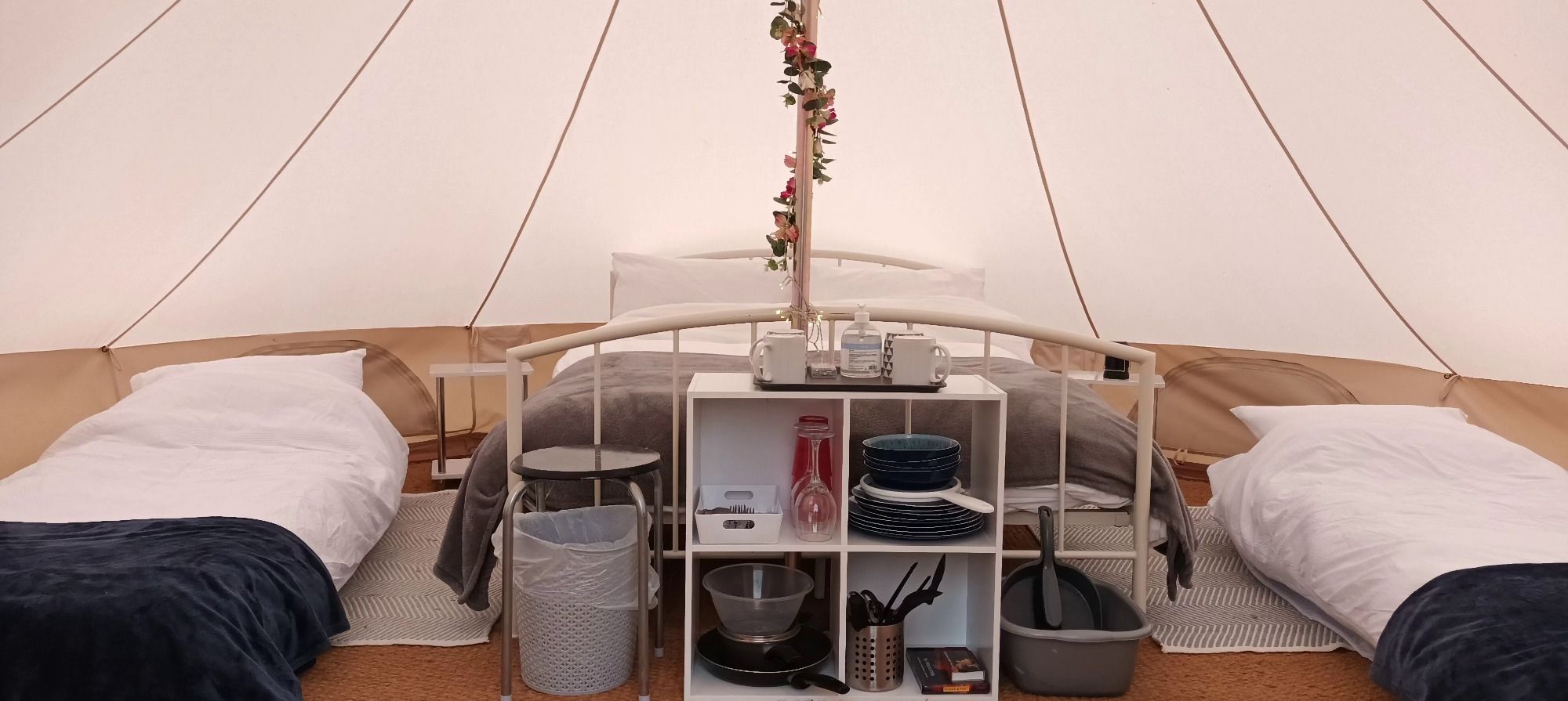 All our tents come with fixed double beds with memory foam mattresses, bedding, bedside tables, fairy lights and kitchen equipment. For the children we supply single airbeds also with bedding provided.